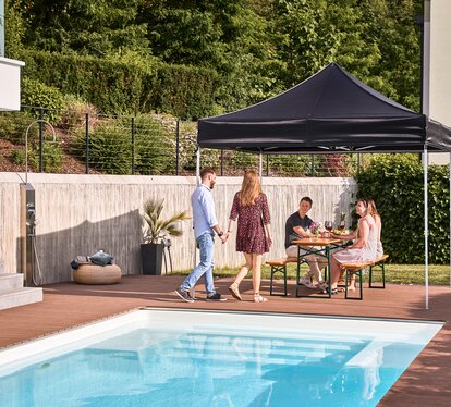 Spending time outdoors? No problem. Carefree and without worries? Yes. Our pop up gazebos have a UPF value of 50+ and therefore offer you excellent protection from the sun. In addition, all our pop up gazebos are 100 % waterproof and therefore suitable for outdoor use 365 days a year.