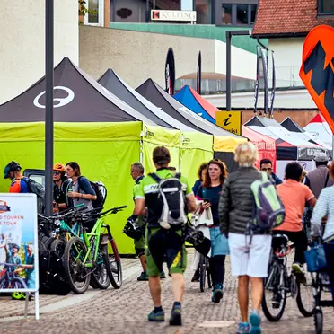 Row of 4x4 m black and lime tents with Ergon logo side walls at the Brixen Bike Festival