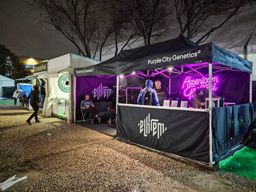 Ecotent® printed pop-up gazebo with leaf design, used as an outdoor bar at night with lights and people enjoying drinks.