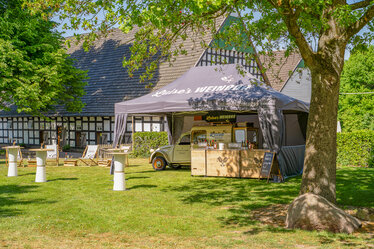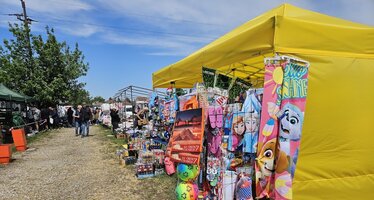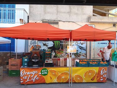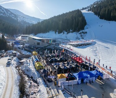 A white, printed folding gazebo from Ecotent's E2 series measuring 4.5 x 3 metres with side walls is used at a sports event organised by Stocksport Austria.